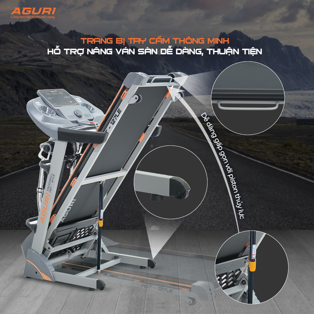 Máy chạy bộ AGURI AGT-127LE - máy chạy bộ tại nhà Đây là máy chạy bộ chính hãng của thương hiệu AGURI - Máy tập của Cầu thủ Công Phượng. Là mẫu máy chạy bộ giá tốt được nhiều người tiêu dùng lựa chọn. Một mẫu máy chạy bộ gấp gọn dễ dàng, tiết kiệm không gian cho người dùng.