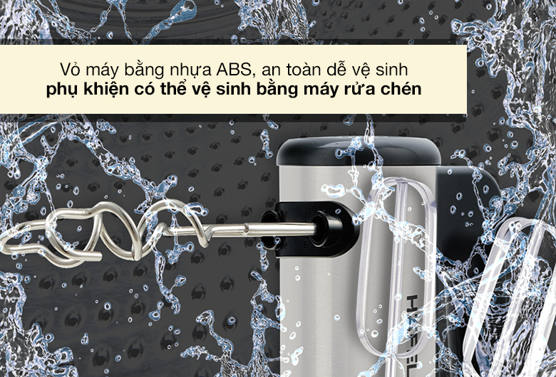 • 4 phụ kiện với chất liệu an toàn: 2 cây đánh trứng và kem bằng thép không gỉ, 2 móc bằng thép không gỉ để trộn bột