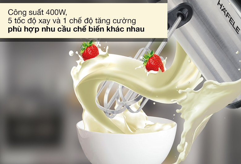 Máy đánh trứng Hafele hỗ trợ hiệu quả nhu cầu làm bếp với với đa chức năng: đánh trứng, trộn bột, trộn kem Nhào trộn nhanh, hiệu quả và bền bỉ nhờ công suất hoạt động