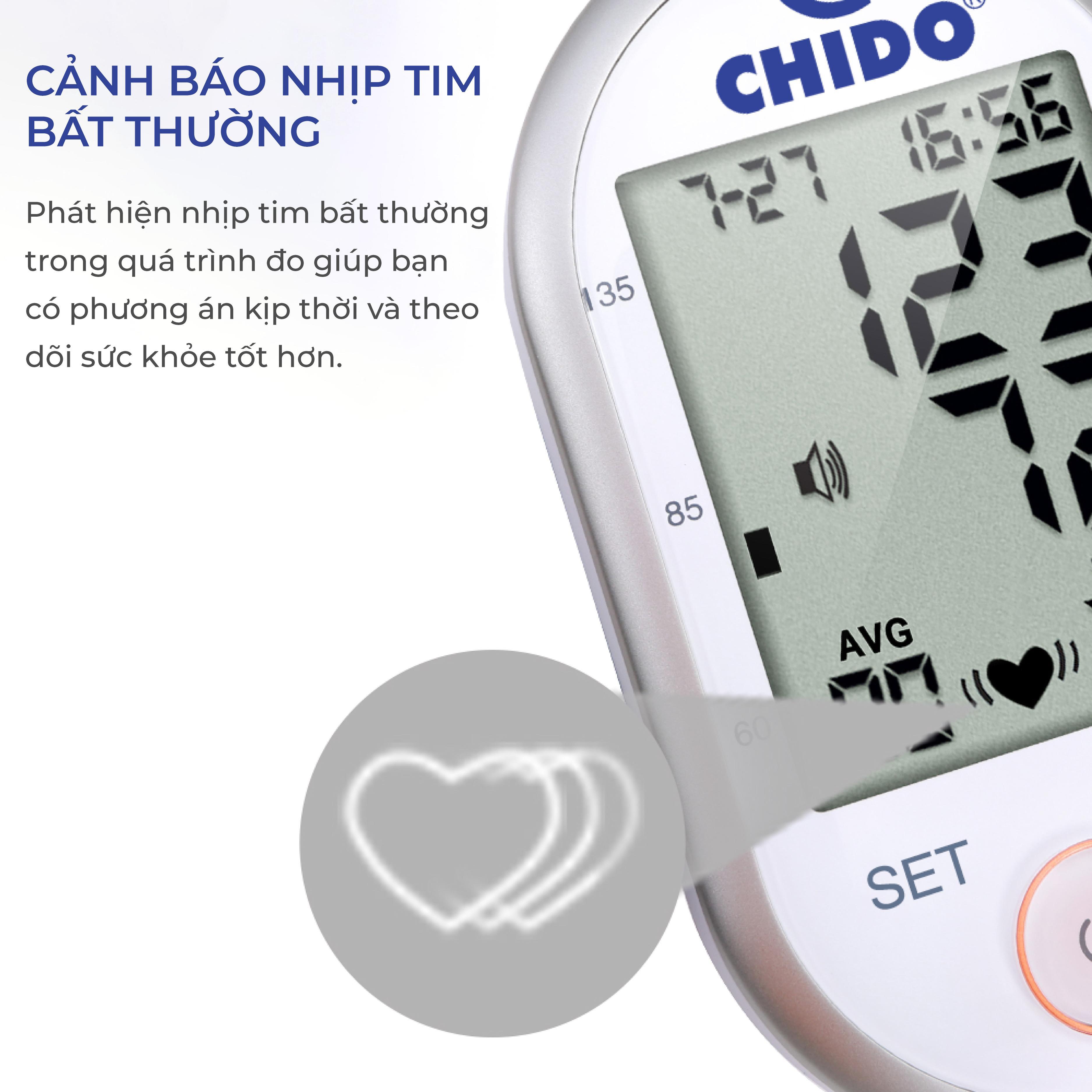 - Tự động đo huyết áp và nhịp tim, cảnh báo nhịp tim bất thường Chỉ sau một vài thao tác đơn giản, dù người già hay trẻ nhỏ đều có thể tự thực hiện tại nhà, máy đo huyết áp cảm ứng Chido sẽ giúp người dùng theo dõi và phát hiện các bệnh về huyết áp và tim mạch.