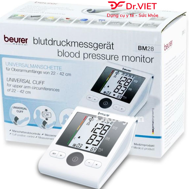 Máy đo huyết áp bắp tay Beurer BM28 giúp đo huyết áp ổn định và chính xác, thích hợp cho những người bị máu nhiễm mỡ và xơ vữa động mạch, người bị tiểu đường. Đặc biệt, máy đo huyết áp Beurer BM28 sở hữu màn hình to rộng giúp người dùng dễ dàng quan sát kết quả đo. Sản phẩm phù hợp cho người cao tuổi, sử dụng trong gia đình để kiểm tra, theo dõi huyết áp, nhịp tim, hạn chế nguy cơ mắc các bệnh nguy hiểm. Hiện nay có rất nhiều loại máy đo huyết áp trên thị trường, tuy nhiên Máy đo huyết áp bắp tay điện tử Beurer BM28 rất được tin dùng vì độ chính xác rất cao, dễ dàng sử dụng và có nhiều ưu điểm nổi trội. Tính năng: -Màn hình LCD sáng rộng, hiển thị rõ nét giúp dễ dàng theo dõi kết quả đo huyết áp. -Có chức năng hẹn giờ đo, báo giờ đo -Tự động bơm khí đầy vòng bít. -Đo huyết áp tối đa (tâm thu), đo huyết áp tối thiểu (tâm trương). -Đo nhịp tim, cảnh báo nhịp tim bất thường. -Dùng được cho các bệnh nhân máu nhiễm mỡ và xơ vữa động mạch -Bộ nhớ dành cho 4 người sử dụng với 30 kết quả trên mỗi người. -Máy đo huyết áp và nhịp tim hoàn toàn tự động trên vùng bắp tay. -Có cột chỉ báo phân loại huyết áp của tổ chức y tế thế gới WHO. -Xem kết quả trung bình của các kết quả đo huyết áp. Cách đo huyết áp với Beurer BM28: