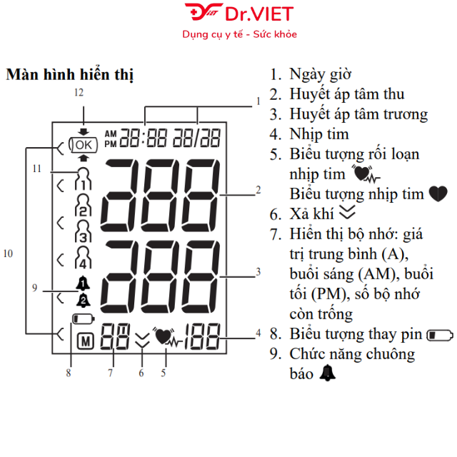 Máy đo huyết áp bắp tay - Chỉ báo mức theo dõi huyết áp theo tiêu chuẩn WHO. - Cảnh báo Phát hiện nhịp tim bất thường. - Bộ nhớ 90 lần x 2 người