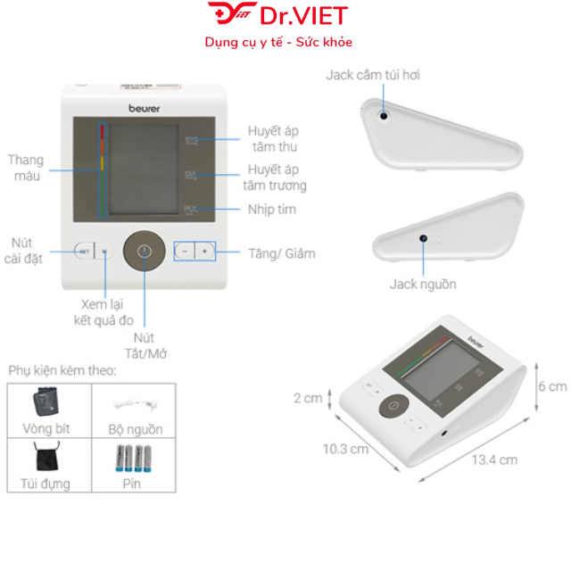 • Thiết bị tự động tắt sau 3 phút. Hãy chờ thêm 5 phút để sử dụng cho lần đo tiếp theo Thông số kỹ thuật: -Thương hiệu: Beurer - Đức -Phương pháp đo: Đo huyết áp dao động,không xâm lấn trên bắp tay. -Mã sản phẩm: BM28. -Dải đo nhịp tim: 40 - 180 nhịp/phút -Chất liệu vỏ máy: Nhựa cao cấp. -Pin 4 pin AA 1,5V -Kích thước (DxRxC): 134 mm x 103 mm x 60 mm. -Trọng lượng: Khoảng 367g (không tính pin) -Màn hình: LCD -Điện thế pin: 6V -Bộ nhớ: 4 x 30 lần đo (120 kết quả đo) -Vòng đời pin: Khoảng 300 lần đo, phụ thuộc vào huyết áp, áp suất bơm. -Chu vi vòng bít: 22 - 42 cm. -Tự động tắt máy khi không sử dụng. -Bảo hành 36 tháng -Sản xuất tại: Trung Quốc. Trọn bộ sản phẩm: 01 Máy đo huyết áp bắp tay, Vòng bít, 4 pin LR6 AA 1.5 V, Túi đựng, Hướng dẫn sử dụng. LƯU Ý -Không nên đo sau khi bạn vừa ăn uống, hút thuốc hoặc tập thể dục. -Sản phẩm máy đo huyết áp bắp tay Beurer BM26 cho kết quả đo chính xác nhất trong điều kiện nhiệt độ 10-40 độ C -Nên lặp lại việc đo sẽ cho bạn giá trị đo chính xác nhất. -Không đo ở trên cổ tay có vết thương.