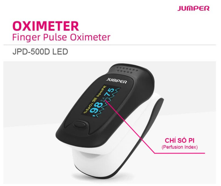Jumper là một thương hiệu quốc tế thuộc quyền sở hữu của Jumper Medical. Là một doanh nghiệp công nghệ cao chuyên nghiên cứu, phát triển và sản xuất phần cứng y tế thông minh đồng thời tích hợp công nghệ thông tin vào các sản phẩm chăm sóc thai sản và trẻ em. Hiện tại Jumper được bán phổ biến trên 70 quốc gia và vùng lãnh thổ trên thế giới. Jumper Medical áp dụng hệ thống ISO 13485-2016 vào quy trình sản xuất, sản phẩm của Jumper đạt các chứng nhận khắt khe nhất trên thế giới như FDA, CE, SGS, CMDCAS, INMETRO, CFDA… Ngoài ra hơn 21 năm phát triển Jumper Medical sở hữu hơn 100 bằng sáng chế và bản quyền phần mềm liên quan đến thiết bị y tế và 3 trung tâm nghiên cứu và phát triển sản phẩm R&D tại châu âu và Mỹ. Giới thiệu máy đo nồng độ oxy trong máu và nhịp tim, chỉ số PI Jumper JPD-500D Máy đo nồng độ oxy trong máu Jumper JPD-500D là thiết bị y tế dùng để theo dõi độ bão hòa của oxy trong máu kết hợp với nhịp tim bằng phương pháp cảm biến quang học thông qua đầu ngón tay với độ chính xác cao. Thiết bị đạt chứng nhận FDA, Mỹ. Ưu điểm của máy Jumper SPO2 JPD-500D: