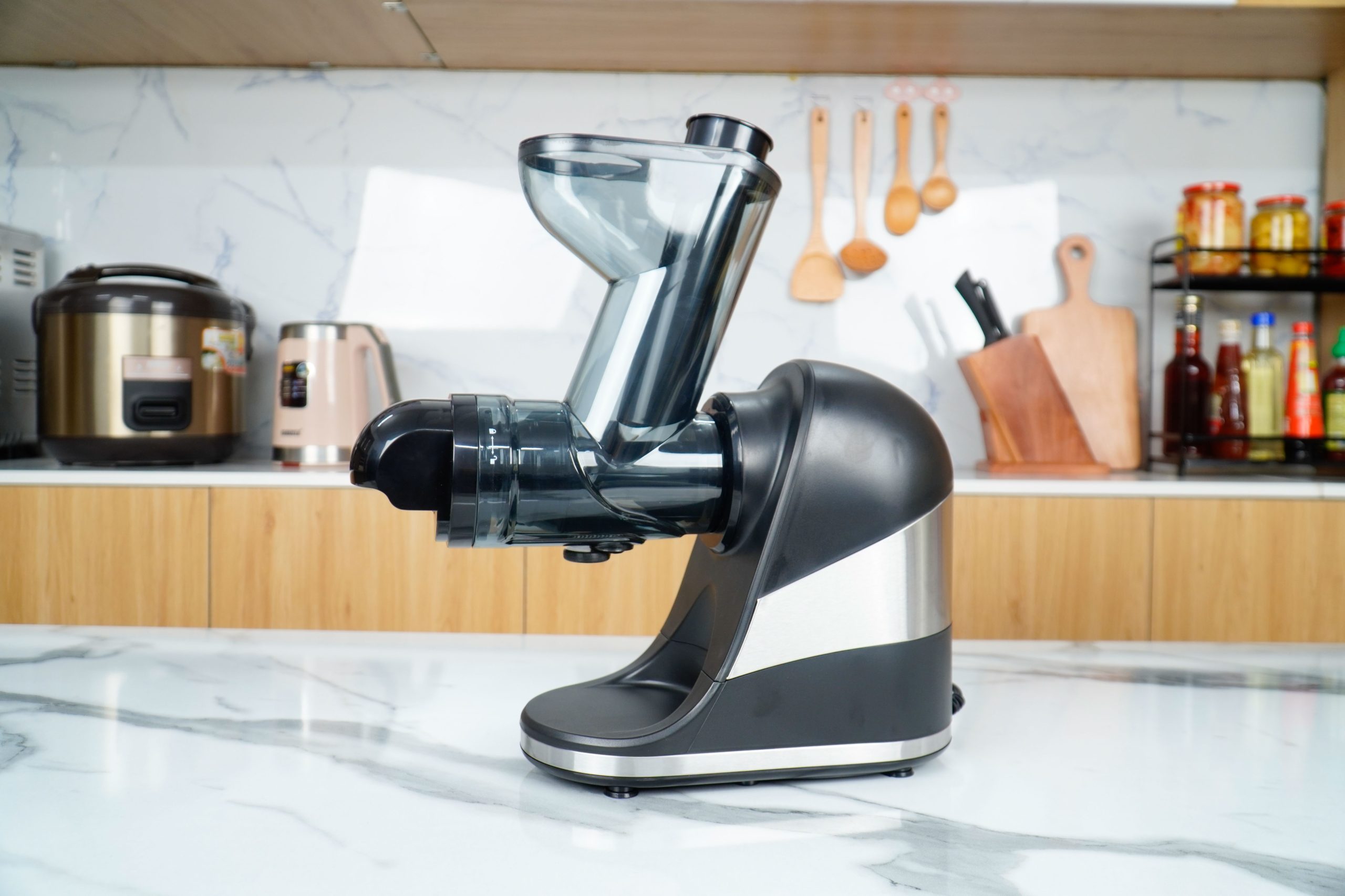 Máy ép trái cây chậm thiết kế mỏng với lớp sơn mờ màu bạc quý phái Cho nước ép thơm ngon, tốt cho sức khỏe với hương vị tự nhiên từ trái cây, rau củ