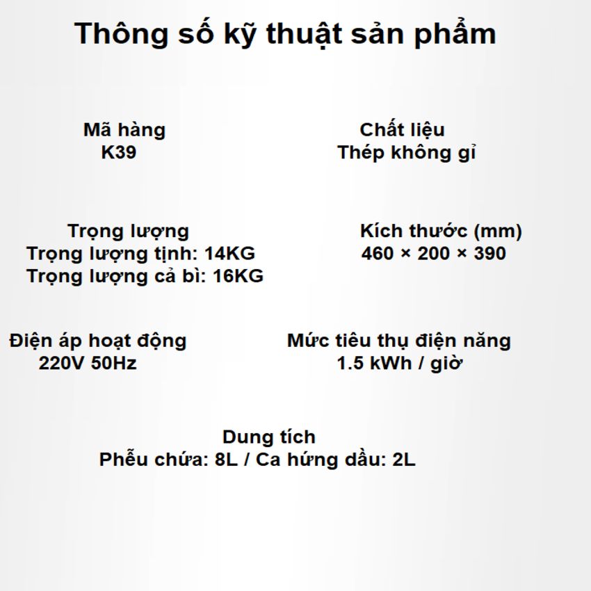 - Trọng lượng máy: 16kg * Bộ sản phẩm bao gồm: 1 thân máy, 1 ca đựng dầu ăn, 1 dây nguồn, 1 lưới lọc, 1 ống nguyên liệu, 1 găng tay và chổi vệ sinh, 1 bộ làm lệch hướng dầu, 1 sách HDSD