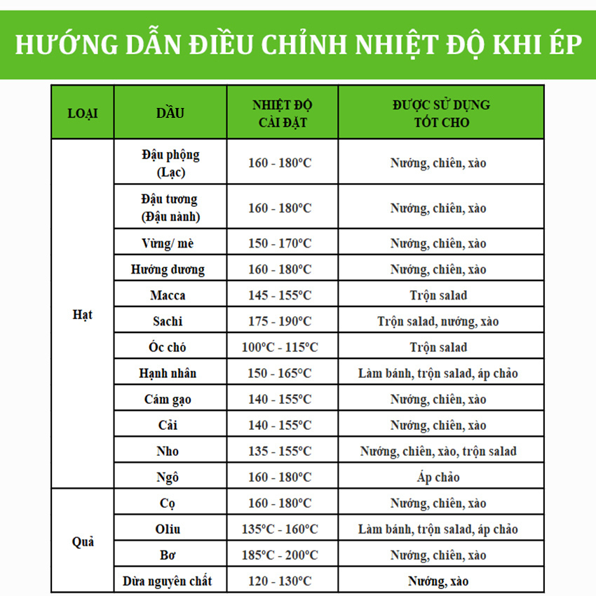 - Cùi Dừa khô: (Thái nhỏ như hạt đỗ, phơi khô vừa tới): 120 - 150ºC => Sau khi ép sẽ ra dầu Dừa