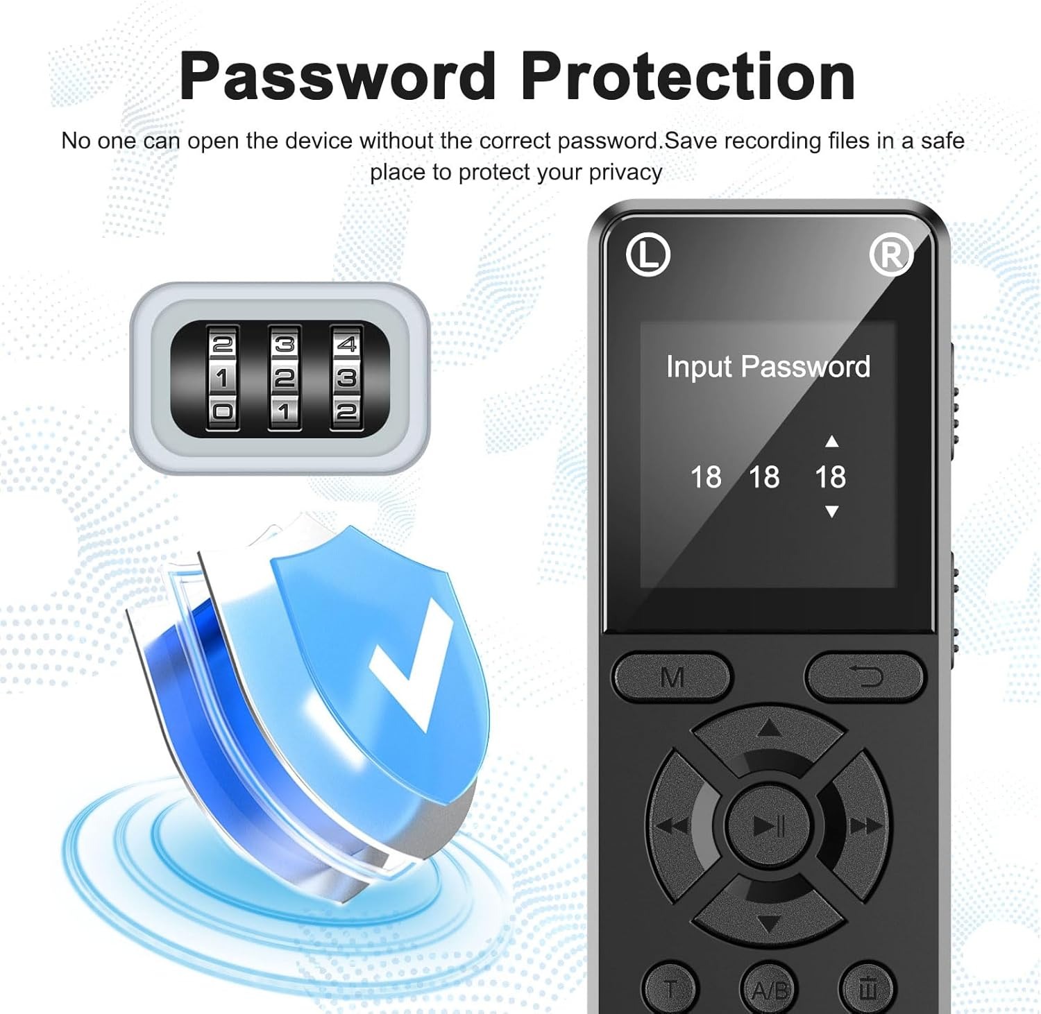 Chất liệu vỏ: Hợp kim kẽm Màn hình: Màn hình màu TFT 1,44 inch Định dạng ghi âm và tốc độ lấy mẫu: Định dạng WAV (32Kbps-1536Kbps) Chất lượng ghi âm: WAV 512Kbps (mặc định)