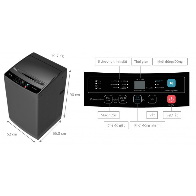 Thông số cơ bản Xuất xứ: Việt Nam Kích thước (R x S x C) (mm): 560 x 630 x 1035 Khối lượng tịnh: 35 Thông số kỹ thuật Khối lượng giặt (KG): 10