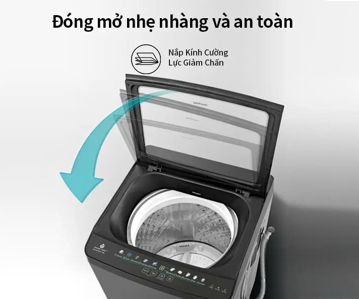 - Nắp Kính Cường Lực Giảm Chấn: Với thiết kế trong suốt, bạn có thể quan sát quá trình giặt một cách dễ dàng. Đồng thời, cơ chế giảm chấn giúp nắp kính đóng mở êm ái, không gây tiếng ồn.