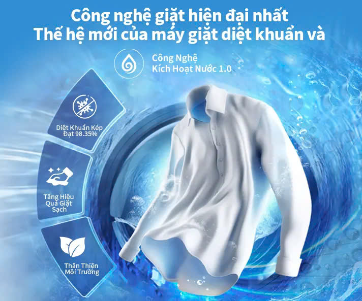 - Activate Water 1.0 - công nghệ kích hoạt phân tử nước và điện hóa, lý tưởng để diệt khuẩn, bảo vệ màu sắc, làm mềm vải và cải thiện hiệu quả giặt tối đa.