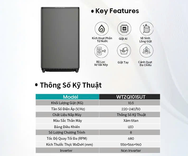 Mua tại TiktokMáy giặt Hisense cửa trên WTZQ1015UT 10.5kg với công nghệ Active Hygiene 1.0 diệt khuẩn kép lên đến 98.35%, công nghệ tạo bọt Bubble Clean loại bỏ bẩn, tránh cặn bột giặt còn sót lại, bộ lọc đôi Magic Filter loại bỏ xơ vải và tạp chất giúp quần áo luôn sạch sẽ, tinh tươm. (*) Chương trình giặt Máy giặt Hisense cửa trên WTZQ1015UT Giặt thường ECO, Giặt nhanh 15′, Xả + Vắt, Đồ mỏng, nhẹ, Chăn/mền, Đồ trẻ em, Giặt mạnh, Vệ sinh lồng giặt (**) Thông số cơ bản Máy giặt Hisense cửa trên WTZQ1015UT
