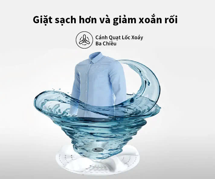 - Cánh quạt được thiết kế theo hình sóng lốc xoáy với tỷ lệ quay và dừng tối ưu, tạo thành dòng nước ba chiều mạnh mẽ, nâng và xoay đồ giặt dễ dàng, giúp giảm xoắn rối & vết nhăn cho quần áo.