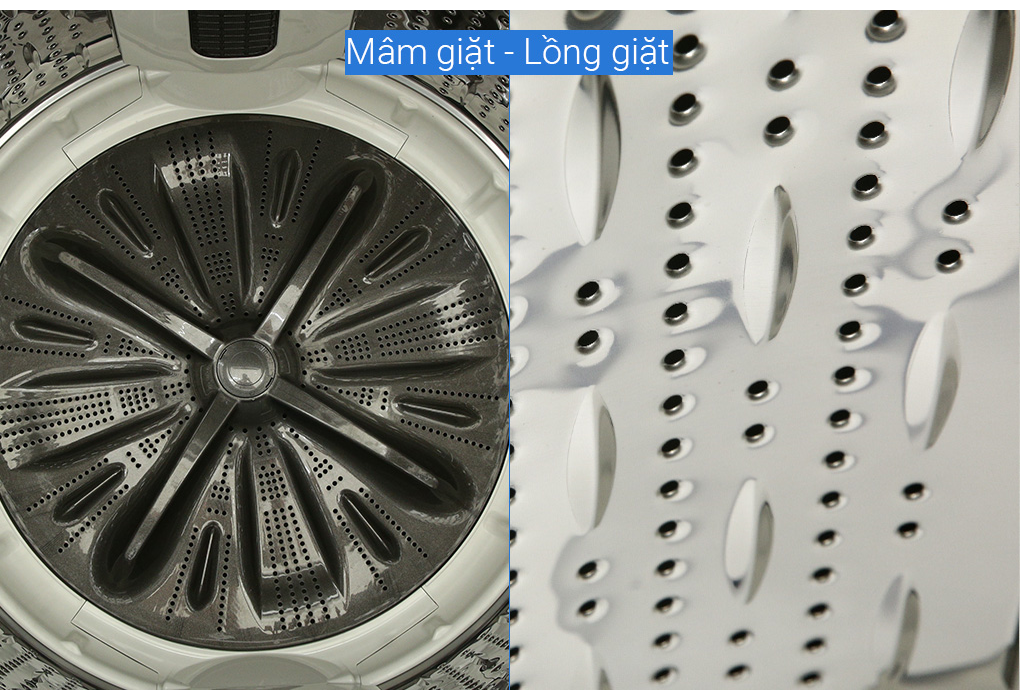 - Lồng giặt thiết kế rộng, trơn cho bạn thoải mái làm sạch các món đồ kích cỡ lớn như ga trải giường, rèm màn, cánh mâm xoay thẳng đứng giúp tạo luồng nước mạnh, chà xát quần áo vào nhau, tăng hiệu quả giặt đồ. Chất liệu inox hạn chế oxy hóa, sử dụng bền tốt, có tính thẩm mỹ cao. *Hình ảnh chỉ mang tính chất minh họa Khối lượng giặt và chương trình giặt