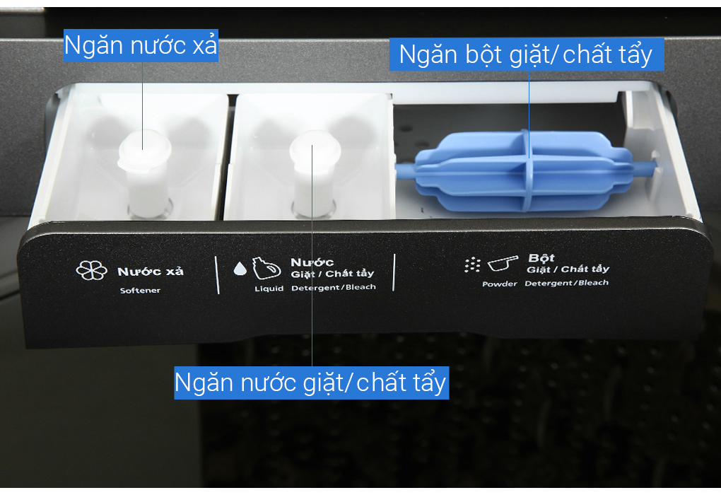 Đặc điểm nổi bật Tự động phân bổ nước giặt xả chính xác theo khối lượng đồ giúp tiết kiệm chất tẩy Ngăn chứa nước giặt xả lớn, chỉ cần đổ đầy 1 lần có