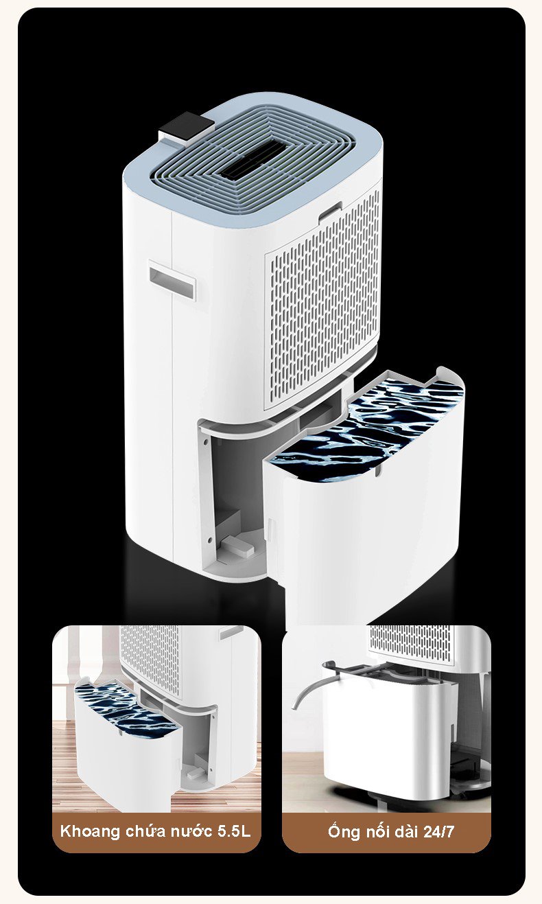 - Siêu khoang chứa nước có dung tích lớn lên đến 5.5L, giúp máy có thể hút ẩm trong thời gian dài mà không cần phải thường xuyên đi đổ nước khi máy hoạt động, làm tăng hiệu quả và tiện ích sử dụng trong các không gian lớn hoặc trong điều kiện độ ẩm cao.