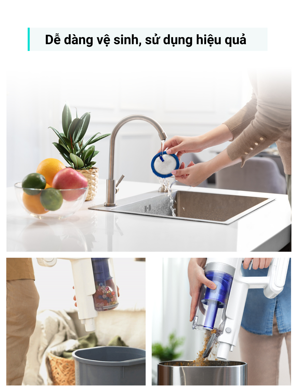 Thiết kế nhẹ, không dây cho phép bạn di chuyển vào các góc và xung quanh đồ nội thất một cách dễ dàng.