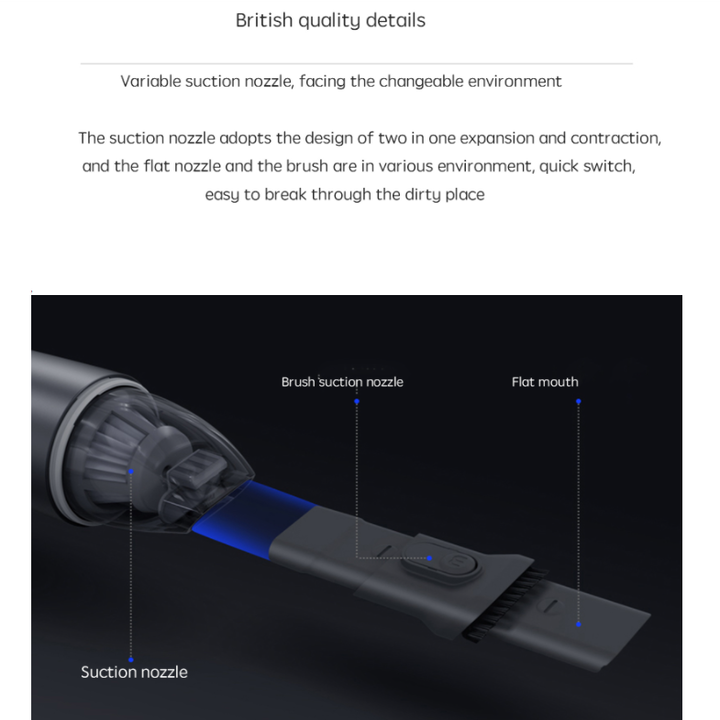 - Điểm khác biệt trong thiết kế đó là máy hút bụi xe hơi MR3936 được trang bị nắp che bụi khá tiện lợi, bên cạnh đó còn giúp cố định máy tốt hơn trong quá trình lưu trữ và sạc. Máy hút bụi Morphy Richards có thiết kế đầu hút và đầu bàn chải tích hợp 2 trong 1, dễ dàng thay đổi chế độ linh hoạt chỉ với 1 nút bấm, đáp ứng nhu cầu làm sạch các vị trí khác nhau 1 cách nhanh chóng. Cụ thể đầu hút có nhiệm vụ làm sạch các không gian hẹp trong xe hoặc trong bàn, trong khi đó bàn chải dùng để làm sạch các bụi bẩn cứng đầu bên trong xe. Trang bị động cơ hoạt động mạnh mẽ