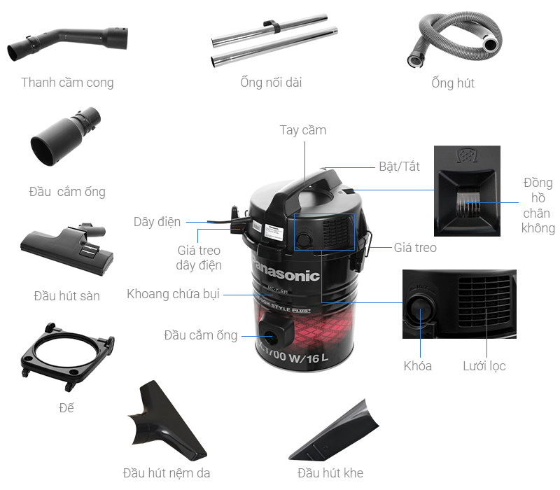 THÔNG SỐ KỸ THUẬT Khoang chứa bụi: Hộp chứa - 16 lít Công suất hoạt động: 1700W Tiện ích: Chiều dài dây điện: 8m Đầu hút bụi: Đầu hút khe Đầu hút sàn Đầu hút đệm Kích thước, trọng lượng: Ngang 36.3 cm - Cao 52.4 cm - Sâu 35.3 cm - 5.5 kg Thương hiệu của: Nhật Bản Sản xuất tại: Malaysia  thiết kế sang trọng, hiện đại, trang bị bánh xe giúp di chuyển linh hoạt  công nghiệp có khả năng hút chất bẩn khô và ướt dễ dàng, người dùng có thể sử dụng sản phẩm làm sạch những khu vực có nhiều nước an toàn, hiệu quả.  cho lực hút mạnh mẽ, hút bụi nhanh chóng, tiết kiệm điện năng tối ưu Bộ lọc kháng khuẩn hiện đại loại bỏ bụi bẩn, vi khuẩn dễ dàng cho không khí trong nhà trong lành, an toàn hơn Dung tích  lớn 16 lít, người dùng hút bụi liên tục trong thời gian dài mà không cần đổ bụi nhiều lần Dễ dàng tháo rời túi chứa để vệ sinh đổ bụi. Đi kèm đầu hút sàn, đầu hút nệm và đầu hút khe Vệ sinh hiệu quả mọi ngóc ngách trong ngôi nhà bạn. Chiều dài dây điện 8m vệ sinh dễ dàng ở khu vực xa nguồn điện Mẹo sử dụng máy hút bụi hiệu quả