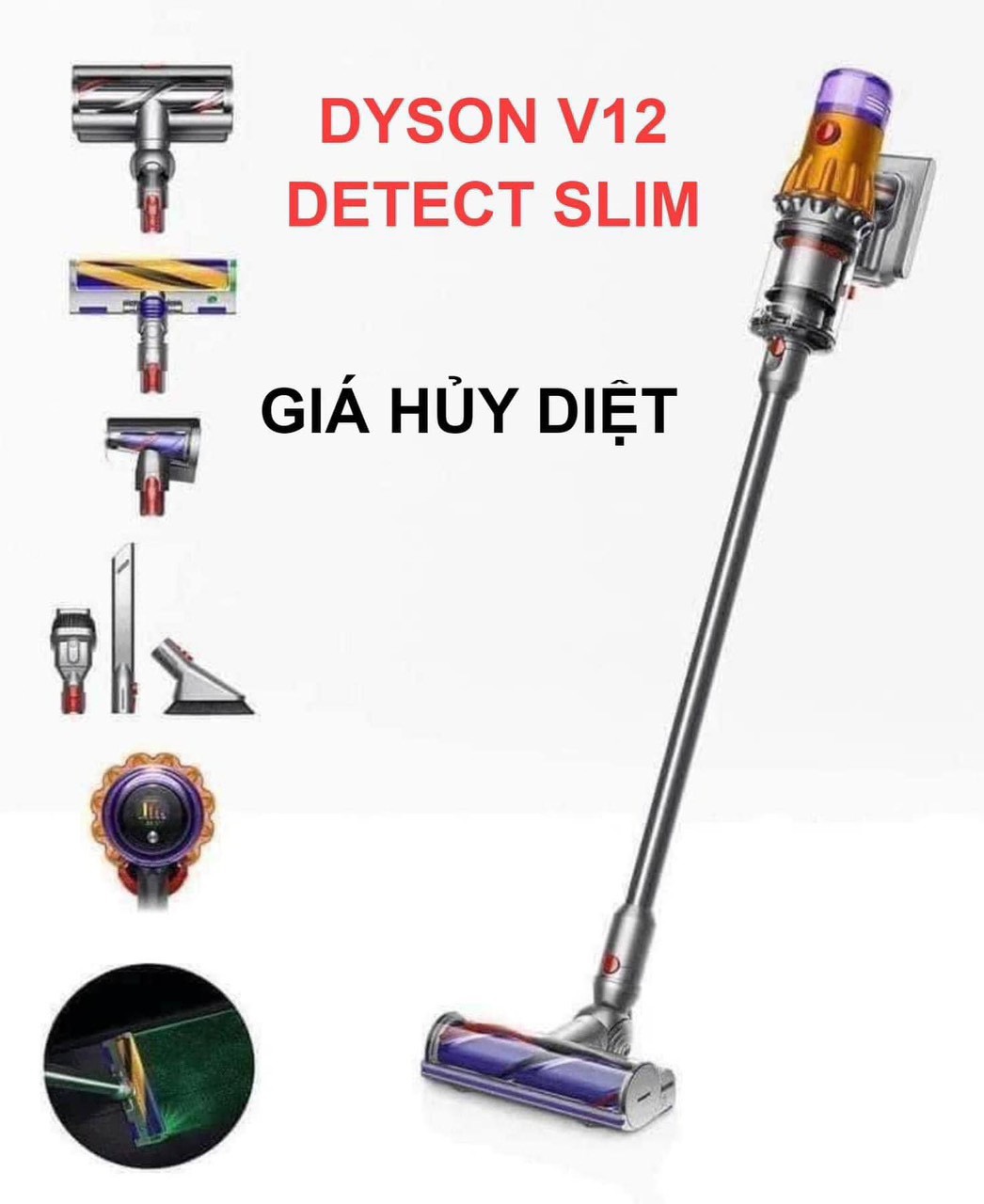 Máy Hút Bụi Dyson V12 Detect Slim ABSOLUTE là một trong những cải tiến hiện đại và đời mới nhất của Dyson mang đến công nghệ chưa từng thấy trước đây cho Máy hút bụi Dyson. Máy hút bụi Dyson V12 bổ sung tia laser xanh tích hợp chiếu sáng các hạt bụi không nhìn thấy bằng mắt trên sàn cứng và cảm biến Piezo có thể đếm các hạt bụi xuống đến mức siêu nhỏ 10 micrômét vào đầu làm sạch Fluffy .