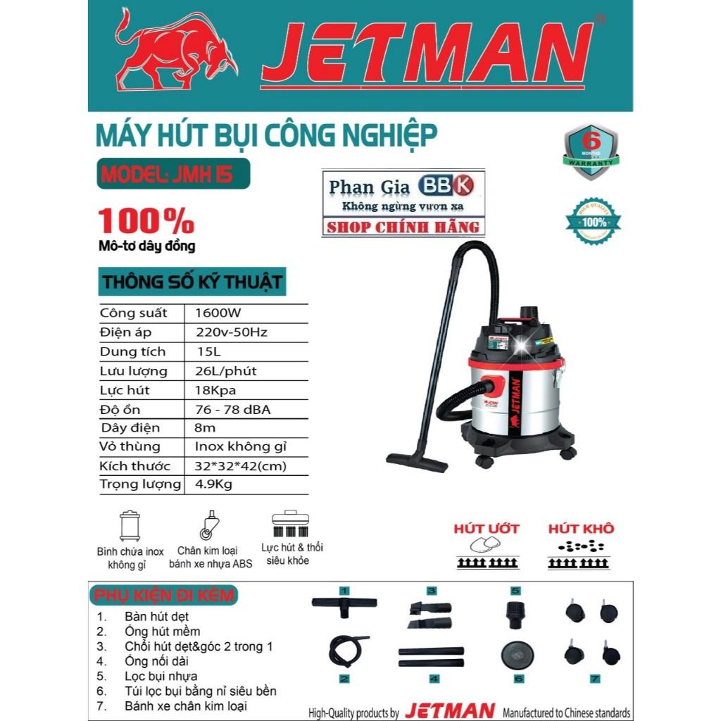 ✨Máy Hút Bụi JETMAN 15L 1600W 3 Chức Năng: Hút khô, Hút ướt, Thổi bụi, 100% Dây đồng (Bảo hành 12 tháng)