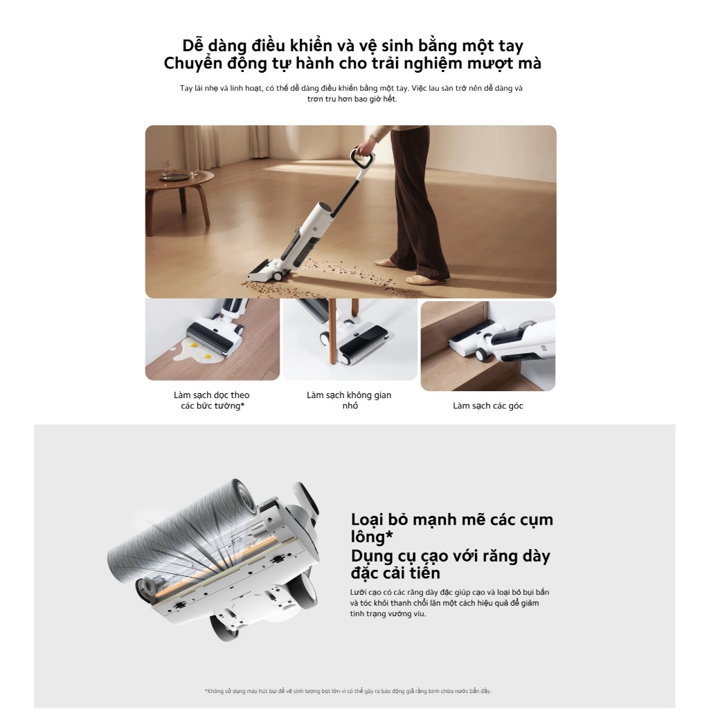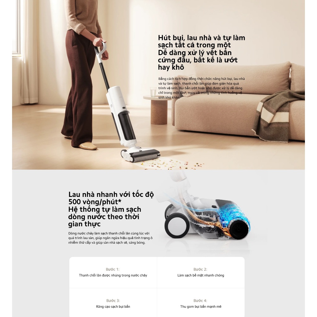 Hút bụi & lau sàn 3 trong 1 – Dọn dẹp hiệu quả chỉ trong một lần thao tác. Máy kết hợp giữa chức năng hút bụi mạnh mẽ và lau sàn vượt trội, giúp loại bỏ cả bụi khô và vết bẩn ướt chỉ trong một lần di chuyển. Giờ đây, việc dọn dẹp trở nên nhanh chóng, tiết kiệm thời gian nhưng vẫn đảm bảo sạch sâu.
