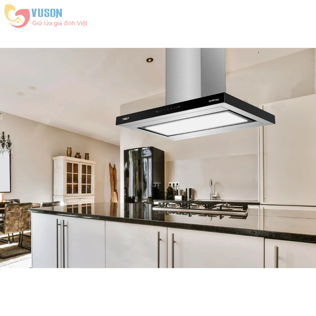 Máy hút mùi đảo hình chữ T sang trọng độc đáo. Màu sắc inox sáng, vành màu đen sang trọng và nổi bật.