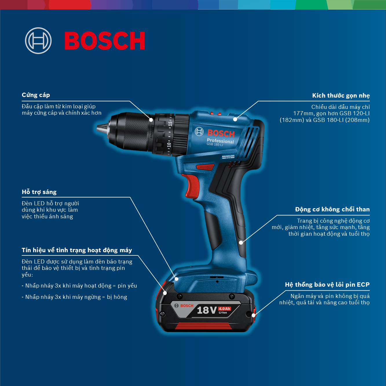 Máy khoan Bosch 18V GSB 185 LI sử dụng động cơ không chổi than Mô men xoắn 50NM Chính hãng
