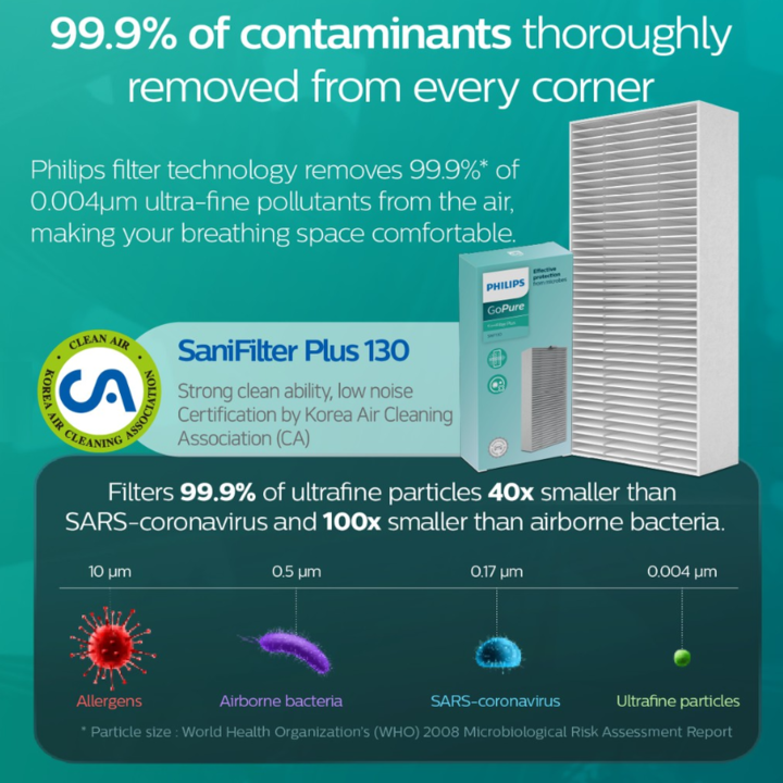 - Bộ lọc SaniFilter Plus 130 loại bỏ vi rút, vi khuẩn và khí độc hại - Động cơ kép, lọc sạch không khí chỉ trong 8 phút