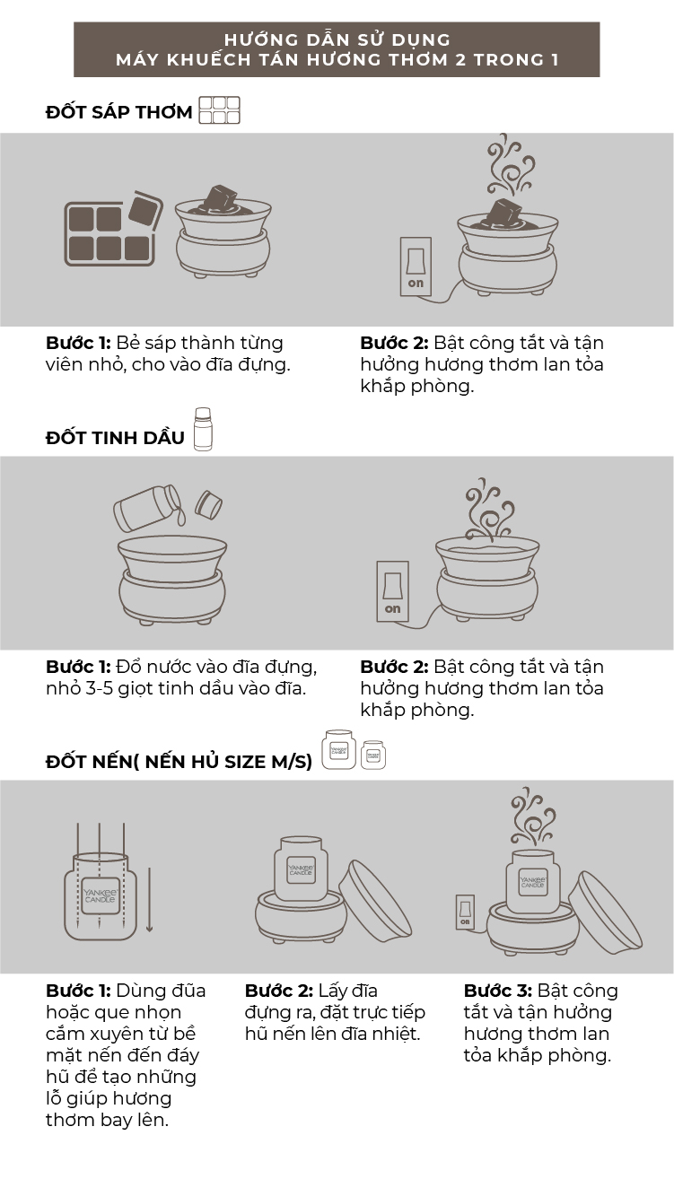 - Vừa làm đốt nến lãng mạn, vừa xông tinh dầu thơm ngát - Khuếch tán mùi thơm, tinh dầu thơm dễ chịu, khử mùi hôi triệt để, đặc biệt hiệu quả với không gian