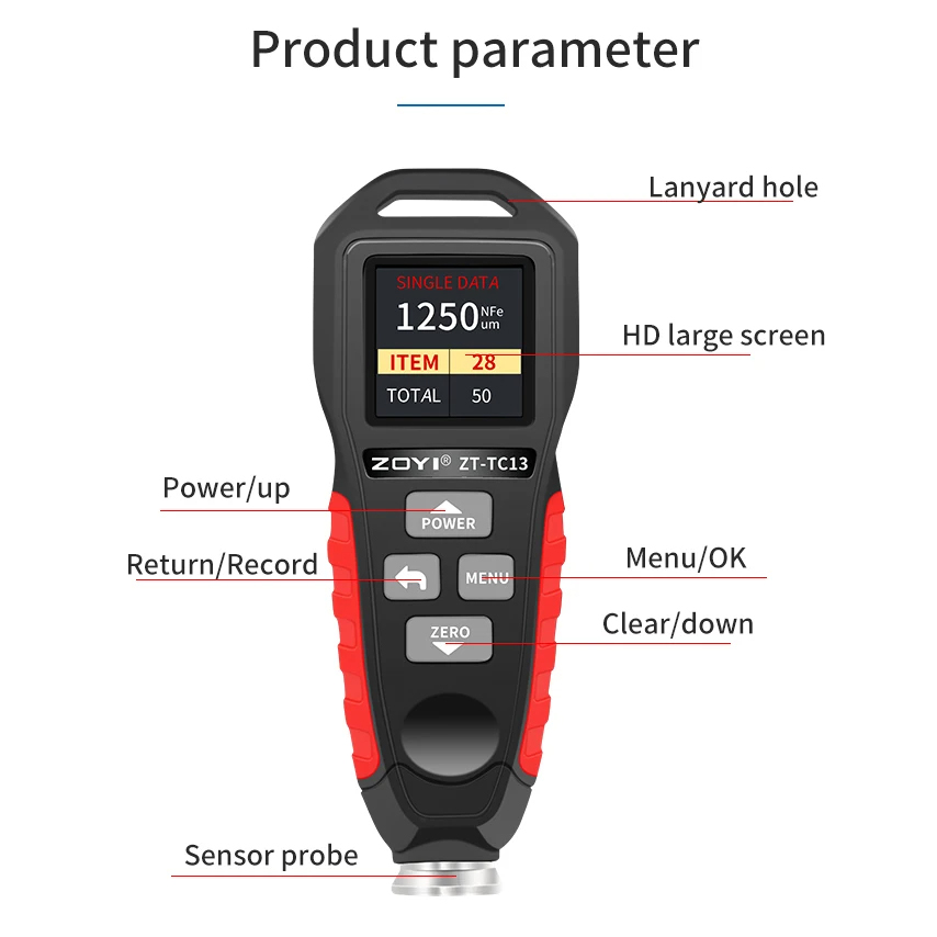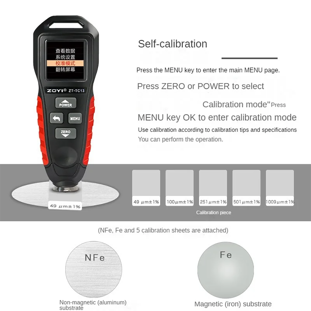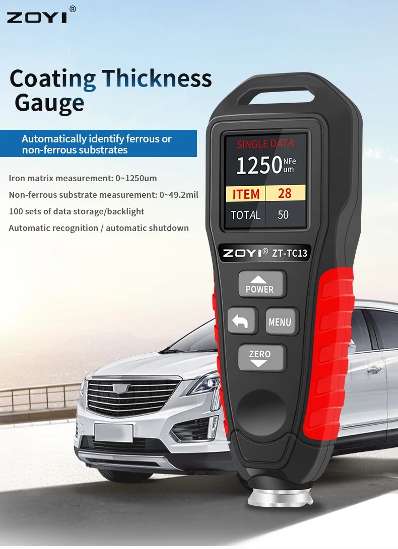 Máy Kiểm Tra Độ Dày Lớp Phủ Cầm Tay ZOYI ZT-TC13 Máy Kiểm Tra Bề Mặt Sơn, Đo Độ Dày Lớp Mạ Kẽm, Máy Đo Độ Dày Sơn,… Đo độ dày lớp phủ với đầu đo từ tính (Fe) và không từ tính như (NFe): nhựa, sắt, thép, nhôm, đồng, sắt không gỉ, kẽm….