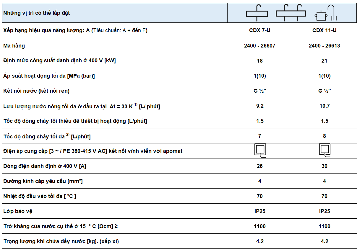 Dòng máy nước nóng tức thì E-compact này không cần sự điều khiển trực tiếp của người dùng, nó được cài đặt để hoạt động bằng các thiết bị cảm biến điện tử chính xác, hiện đại và đáng tin cậy. Công suất đun nóng nước được điều khiển tự động tùy thuộc vào tốc độ dòng chảy và nhiệt độ đầu vào. Trong quá trình sử dụng hàng ngày, nhiệt độ nước sẽ được điều chỉnh bằng vòi pha trộn với nước lạnh. > – Máy nước nóng tức thì được điều khiển điện tử dưới bồn rửa với thiết kế nhỏ gọn và không có sự điều khiển trực tiếp của người dùng, thiết bị sẽ tự động điều chỉnh nhiệt độ dựa trên tốc độ dòng chảy và nhiệt độ nước đầu vào để có nhiệt độ nước nóng đầu ra ổn định. > – Nhiệt độ nước đầu ra tối đa được cài đặt sẵn tại nhà máy là 50°C, điều chỉnh lại nhiệt độ nước bằng cách pha thêm nước lạnh tại vòi để đạt được nhiệt độ nước như mong muốn. > – Dễ dàng lắp đặt bên dưới bồn rửa nhà bếp nhờ kích thước nhỏ và đầu nối nước ⅜ ” bên ngoài để lắp đặt không có lỗ thông hơi hoặc thông hơi, Bộ kết nối (cút nối chữ T và ống nối mềm) cho một van góc đã bao gồm sẵn trong bộ sản phẩm > – Có cáp nguồn cho nguồn điện đầu vào 3 pha Lắp đặt đơn giản và nhanh chóng Đầu ống kết nối nước phía bên trên – Các mẫu CDX-U, CEX-U và CFX U có đầu ống kết nối nước ⅜” và có chiều hướng lên bên trên. Chúng được thiết kế với vị trí lắp đặt bên dưới chậu rửa và kết nối trực tiếp với đường ống cấp nước hoặc ống nước vào của vòi xả. Khoảng cách từ máy nước nóng tức thì đến vòi rửa càng ngắn sẽ càng đạt hiệu quả cao. Bộ kết nối (Cút nối chữ T và ống nối mềm) được trong bị sẵn trong bộ thiết bị, tạo điều kiện thuận lợi cho việc kết nối vào các vòi dẫn nước hiện có. Tùy chọn phương án lắp đặt: Máy nước nóng tức thì nhỏ gọn dòng C có 2 phương án để lắp đặt là không có lỗ thông hơi hoặc không có lỗ thông hơi. Việc lựa chọn các vòi xả và bộ thiết bị lắp đặt cho các vòi tiêu chuẩn được trình bày tại trang 54 và 55. Giải pháp cho việc nâng cấp: Mô-đun giảm tải Công tắc giảm tải (còn được gọi là chuyển mạch ưu tiên) cho phép sử dụng chung kết nối điện của hai phase điện 400 Volt. Ví dụ, một máy đun nước nóng tức thì CLAGE có thể được vận hành với nguồn kết nối điện hiện có của bếp điện cơ. Khi pha chế nước nóng, máy nước nóng tức thì sẽ tạm thời tắt bếp. Điều này hầu như không đáng chú ý, vì nồi đã duy trì nhiệt độ cần thiết để tiếp tục nấu hoặc nướng trong thời gian ngắn khi nước từ bình nước nóng tức thì CLAGE được sử dụng. > trang 54 Tiết kiệm thêm không gian Kích thước nhỏ của thiết bị tiết kiệm nhiều không gian để lắp đặt các thiết bị khác như cho hệ thống phân loại rác thải hoặc các thiết bị khác. Cài đặt nhiệt độ chính xác với công nghệ hiện đại Việc pha thêm nước lạnh để đạt được nhiệt độ nước tối ưu là không cần thiết. Thiết bị điện tử công suất với công nghệ kiểm soát nhiệt độ kép TTC (TWIN TEMPERATURE Control TTC) đảm bảo kiểm soát nhiệt độ nước đầu ra chính xác với bước cài đặt đến 0,5°C, ngay cả khi áp suất nước không ổn định. Vị trí lắp đặt dưới bồn rửa chén giúp đường ống dẫn nước không quá dài, giảm bớt thời gian chờ đợi để có nước ấm đồng thời tiết kiệm nước. Hoạt động bền bỉ và an toàn Hệ thống kiểm soát an toàn điện tử với khả năng phát hiện bọt khí tồn đọng trong ống dẫn làm tăng độ an toàn và tuổi thọ của thiết bị. Định mức công suất linh hoạt giúp hoạt động thuận tiện Cài đặt công suất hoạt động linh hoạt với Hệ thống thích hợp nhiều nguồn MPS (Multiple Power System MPS), định mức công suất tối đa sẽ được cài đặt tại thời điểm thiết lập các thông số cho máy với các tùy chọn: 6,6 hoặc 8,8 kW 230 V, 11 hoặc 13,5 kW 400 V Hoạt động thuận tiện Điều khiển từ xa cho phép lựa chọn nhiệt độ thuận tiện hơn khi máy nước nóng tức thì với kích thước nhỏ gọn được lắp đặt ẩn dưới bồn rửa bát. Chỉ với một nút bấm, nhiệt độ nước ở đầu ra sẽ được đun nóng chính xác đến nhiệt độ được thiết lập để rửa bát đĩa hoặc rửa tay mà không cần pha trộn thêm nước lạnh tại vòi. Điều khiển từ xa được gắn vào tường với giá đỡ từ tính tiện lợi và chắc chắn. Như một tùy chọn, thiết bị cũng có thể được vận hành thông qua ứng dụng “Smart Control”. Ít cặn vôi bám hơn Hệ thống kiểm soát nhiệt độ nước ấm hiệu quả IES làm giảm gần như toàn bộ cặn vôi giúp thiết bị có tuổi thọ cao hơn, đồng thời dễ dàng bảo trì, bảo dưỡng. Nước được làm nóng tới nhiệt độ cài đặt chỉ vài giây sau khi mở vòi. Thông số kỹ thuật: Ghi chú: