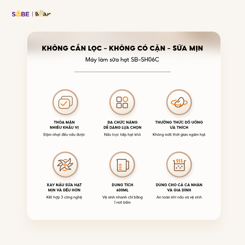 Mua tại TiktokMô Tả Sản Phẩm Máy làm sữa hạt Bear 0.6L SB-SH06C với màu kem sang trọng không chỉ giúp bạn xay nấu những ly sữa hạt bổ dưỡng mà còn là vật dụng decor làm không gian bếp của bạn thêm phần điểm nhấn đấy. Với nhiều tính năng thông minh tích hợp, máy trở thành trợ thủ đắc lực giúp bạn chế biến các loại đồ uống ngay tại nhà một cách dễ dàng, tiết kiệm thời gian.