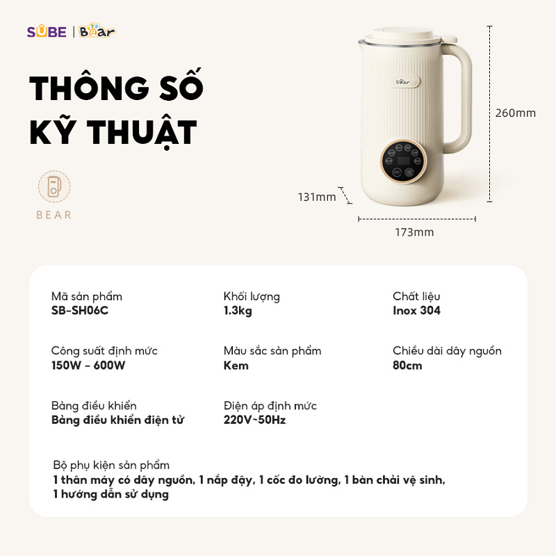 - Thông số kĩ thuật của sản phẩm Tên sản phẩm Bear SB-SH06C Màu sắc Kem Dung tích 600ml Công suất 150W-600W Điện áp 220V-50Hz Chất liệu Nhựa PP an toàn Kích thước 173131266mm Phiên bản Quốc tế/ ngôn ngữ tiếng việt Bảo hành 18 tháng Phụ kiện 1 thân máy có dây nguồn, 1 nắp đậy, 1 cốc đo lường, 1 bàn chải vệ sinh, 1 hướng dẫn sử dụng
