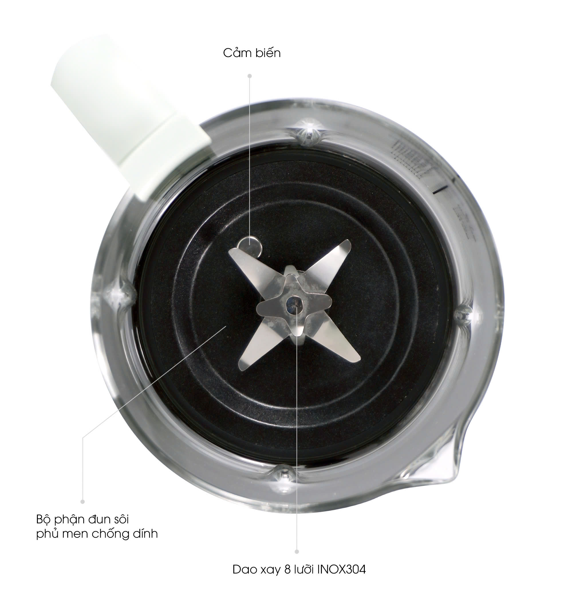 Cấu tạo cối thủy tinh,dao xay 10 lưỡi inox 304 sắc bén, ít bị mài mòn, bền bỉ theo thời gian, bộ phận đun sôi phủ men chống dính dễ dàng vệ sinh. Bộ nhông truyền lực bằng kim loại.
