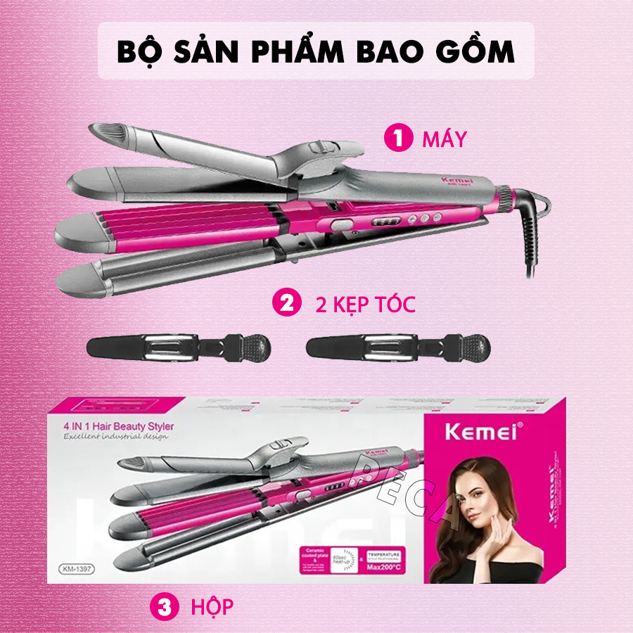 MÁY LÀM TÓC ĐA NĂNG 4IN1 KEMEI KM-1397 ĐIỀU CHỈNH 4 MỨC NHIỆT ĐỘ PHÙ HỢP VỚI MỌI LOẠI TÓC - HÀNG CHÍNH HÃNG   ƯU ĐIỂM NỔI BẬT: Chỉ cần thay đổi mái tóc trông bạn sẽ xinh đẹp lên rất nhiều,máy làm tóc KM-1397 chính là trợ thủ đắc lực của bạn. + Với chức năng 4 in 1 máy vừa có thể duỗi, dập xù và uốn cúp,uốn xoăn, tạo kiểu hippie ..tha hồ cho bạn sáng tạo các kiểu tóc yêu thích. + Với mức nhiệt độ phù hợp cho công việc làm tóc của bạn trở nên đơn giản và tiết kiệm thời gian hơn bao giờ hết. + Bạn sẽ có 1 mái tóc đẹp,xinh xắn và bồng bền chỉ trong vài phút,an toàn -tiện lợi mà giá cả lại hợp túi tiền.     CHI TIẾT SẢN PHẨM:   ️ Thiết kế đơn giản, chất liệu cao cấp, an toàn khi sử dụng. ️ Máy đa chức năng 4in1 có thể dùng để duỗi tóc thẳng, bấm xù tóc, uốn tóc, uốn sóng hippie... tạo kiểu tùy thích tích hợp trong 1 máy   ️ Nút ON/OFF, tăng/ giảm nhiệt độ thiết kế bấm linh hoạt dễ dàng thao tác   ️ Nóng nhanh 35s, nhiệt độ ổn định đúng mức nhiệt bạn đang điều chỉnh     ️ Có 4 mức nhiệt 140, 160,180, 200 độ C giúp bạn dễ dàng điều chỉnh phù hợp với mọi loại kiểu tóc.     ️ Dây điện dài 2m xoay 360 độ có móc treo cất giữ tiện lợi di chuyển thao tác linh hoạt     ️ Kích thước sản phẩm:  ️Thiết kế đơn giản với nút ON/OFF ️ Nhấn nút +/- để điều chỉnh nhiệt độ. Tăng/Giảm.   HƯỚNG DẪN SỬ DỤNG:    UỐN ( có thể uốn cụp, xoăn sóng nước...) - Chọn một lọn tóc nhỏ, kẹp phần đầu của lọn tóc - Cuốn lọn tóc bên ngoài ống, từ dưới lên - Giữ vài giây sau đó tháo lọn tóc  DUỖI THẲNG - Chuyển sang chức năng duỗi - Chọn một lọn tóc nhỏ, kẹp phần đầu của lọn tóc - Cuốn lọn tóc bên ngoài ống, từ dưới lên ️ DẬP XÙ/ HIPPIE - Chuyển sang chức năng dập - Chọn một lọn tóc nhỏ, kẹp và giữ vài giây
