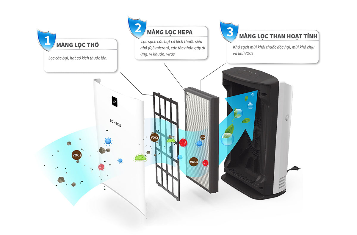 Giúp lọc sạch trên 99,9% các loại hạt (kích thước > 0,3 micron), bụi mịn (PM2.5), các tác nhân gây dị ứng, hen suyễn (phấn hoa, lông vật nuôi, sợi vải bô), vi khuẩn, virus, mùi khó chịu (nấu ăn, mùi hóa chất vệ sinh nhà cửa đồ dùng, mùi sơ), khói thuốc độc hại (kích thước < 0,3 micron)