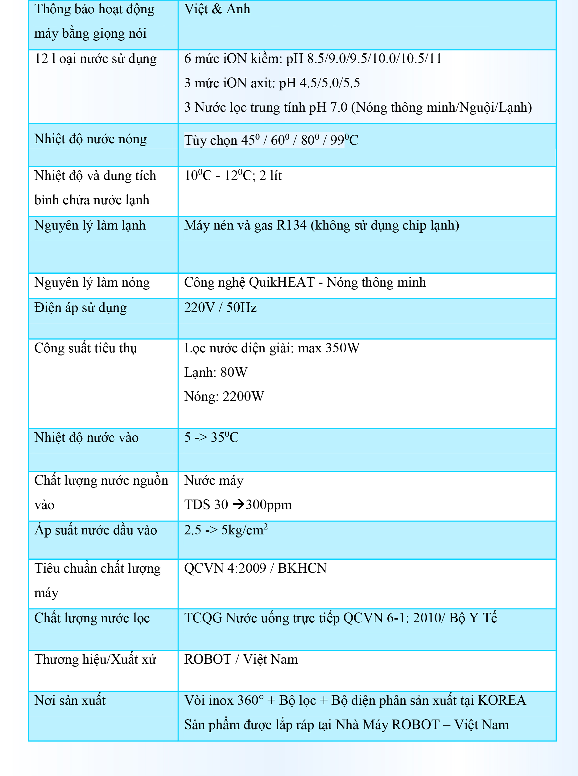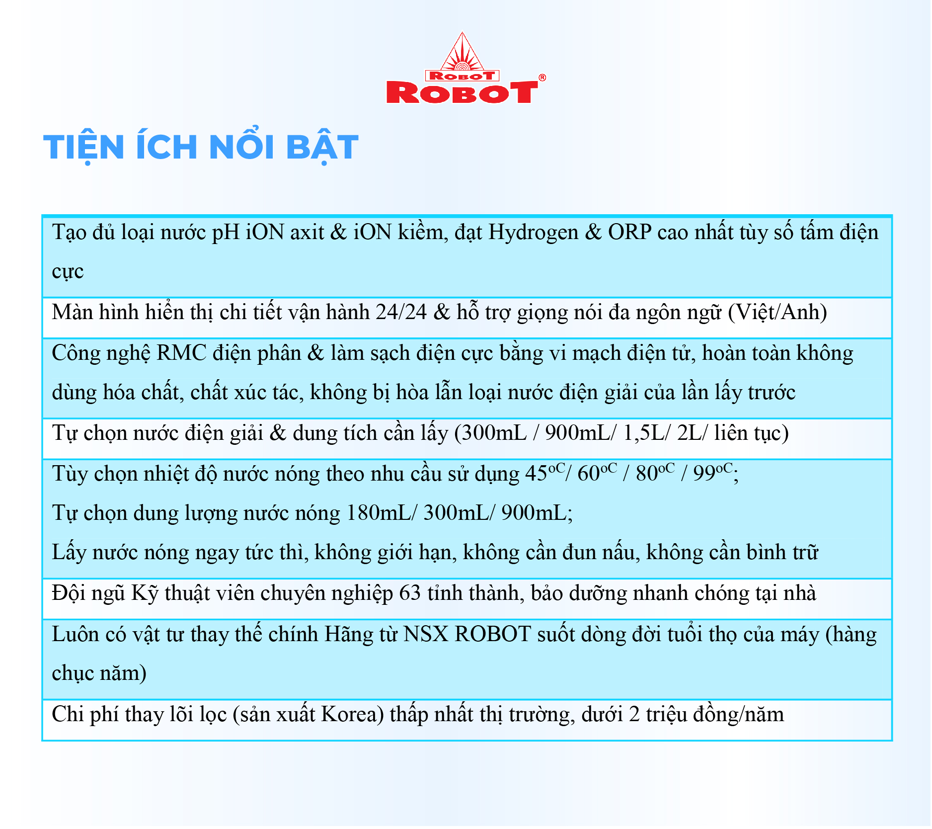 - Máy lọc nước điện giải iON kiềm ROBOT ionKing 912 là sản phẩm được sản xuất với công nghệ tiên tiến, cao cấp trang bị đến 9 tấm điện cực lớn nhất, có khả năng tạo ra đến 12 loại nước đa chức năng, với 6 mức nước iON kiềm (pH 8.5 11.0), nước lọc trung tính (pH 7.0) Nguội – Nóng – Lạnh & 3 mức nước iON axit (pH 4.5 - 5.5). Chất lượng nước đạt chỉ số tối ưu, nồng độ Hydro hoạt tính lên đến ~ 1300 -> 1700 ppb, chống oxy hóa (ORP) lên đến ~ - 800 -> -900 mV, đáp ứng mọi nhu cầu sử dụng trong cuộc sống.