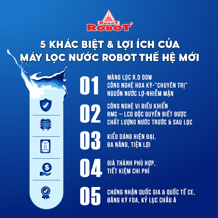 • Các sản phẩm máy lọc nước ROBOT đều sở hữu màn hình LCD sắc nét, hiển thị chi tiết các thông số TDS – chất lượng nước trước & sau lọc, tuổi thọ lõi lọc 24/24… để mọi người đều dễ dàng theo dõi hoạt động máy, chất lượng nước uống thông qua màn hình LCD, loại trừ mọi rủi ro, mang đến sự an toàn tuyệt đối khi sử dụng.   Bộ vi mạch RMC-LCD thông minh thiết kế phát minh của ROBOT, mọi chi tiết vận hành máy được hiển thị trên màn hình LCD, cảnh báo mọi rủi ro cho người sử dụng   Tuổi thọ lõi lọc được tính theo lưu lượng nước sử dụng, không tính theo thời gian ghim điện như các máy thông thường, tiết kiệm tối đa chi phí thay lõi lọc