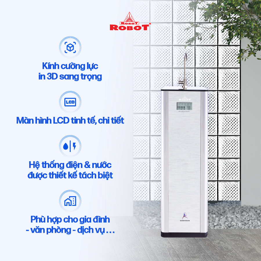 - Các sản phẩm máy lọc nước ROBOT đều sở hữu màn hình LCD sắc nét, hiển thị chi tiết các thông số TDS – chất lượng nước trước & sau lọc, tuổi thọ lõi lọc 24/24… để mọi người đều dễ dàng theo dõi hoạt động máy, chất lượng nước uống thông qua màn hình LCD, loại trừ mọi rủi ro, mang đến sự an toàn tuyệt đối khi sử dụng.