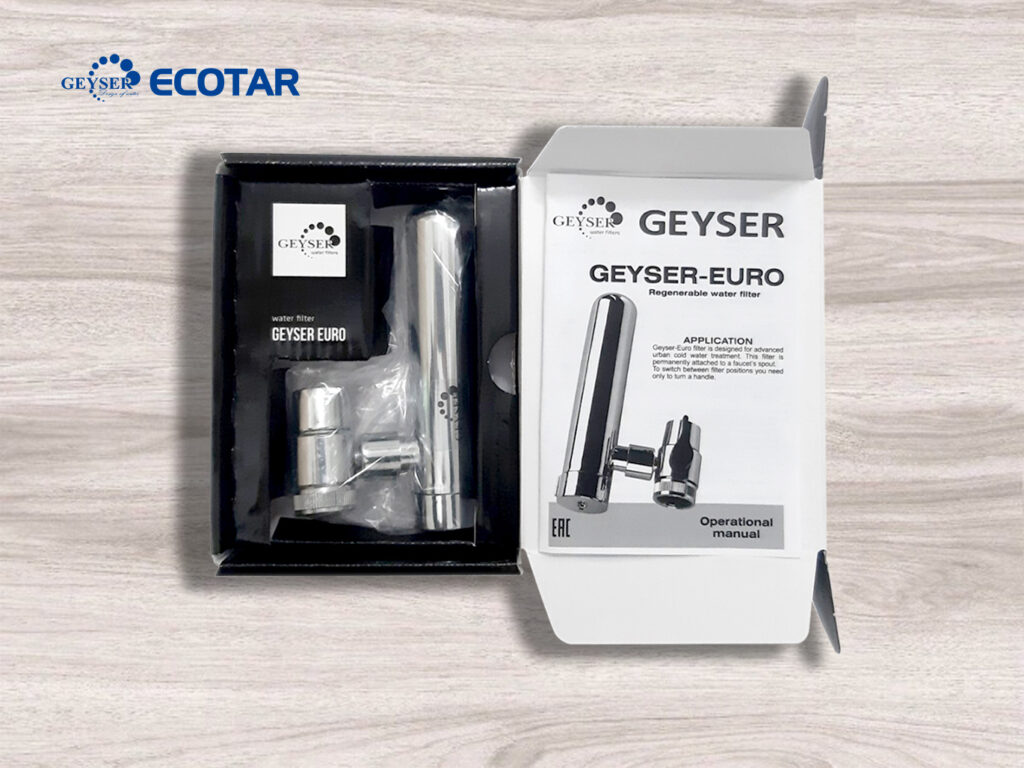 • Khả năng xử lý thực tế còn phụ thuộc vào chất lượng nước đầu vào, lõi cần hoàn nguyên theo tiêu chuẩn 300 lít/ lần. Lắp đặt và sử dụng máy lọc nước tại vòi Geyser Euro Máy lọc nước tại vòi Geyser Euro được lắp đặt rất đơn giản và nhanh chóng cùng bộ phụ kiện kèm máy. Máy lọc nước tại vòi Geyser Euro khách hàng 100% có thể tự lắp đặt, thay lõi tại nhà với những thao tác rất đơn giản: Geyser Euro M – Thiết kế van 2 chiều cho nước lọc và nước không lọc thuận tiện cho việc sử dụng Thao tác thay lõi lọc Geyser Euro M Thao tác thay lõi được làm băng tay kèm bộ kit đi kèm máy. Cấu tạo của máy lọc tại vòi Geyser Euro M Máy lọc nước tại vòi Geyser Euro M được cấu tạo gồm: