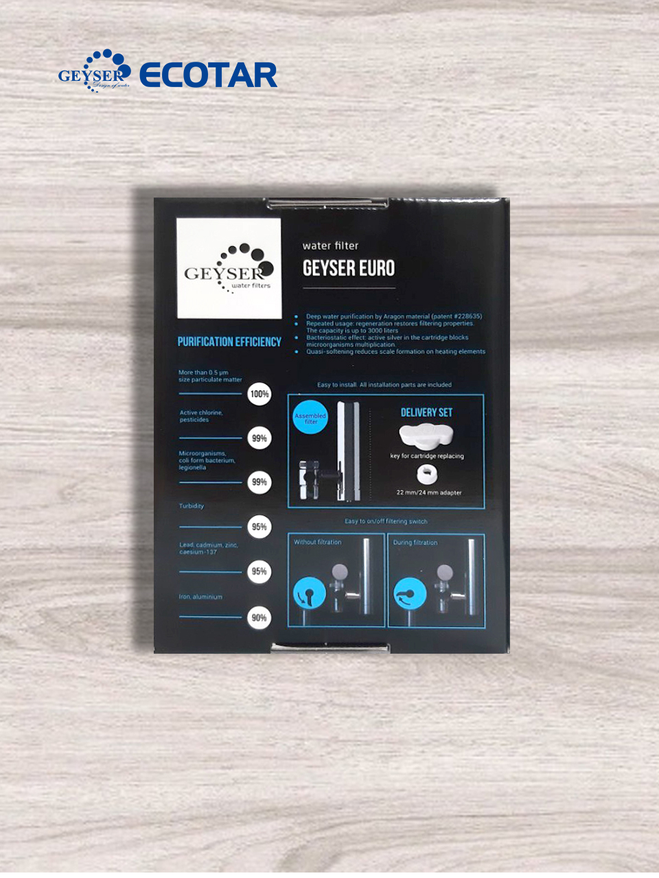 • Thời gian thay lõi: 4 tháng. Đập hộp máy lọc nước tại vòi Geyser Euro Phụ kiện máy lọc nước tại vòi Geyser Euro MẶT TRƯỚC VÀ MẶT SAU CỦA HỘP MÁY LỌC NƯỚC TẠI VÒI GEYSER EURO Lưu ý: “Máy lọc nước tại vòi không thay thế được chức năng của máy lọc nước ăn uống gia đình”   Máy lọc nước tại vòi Geyser Euro M dễ dàng mang theo