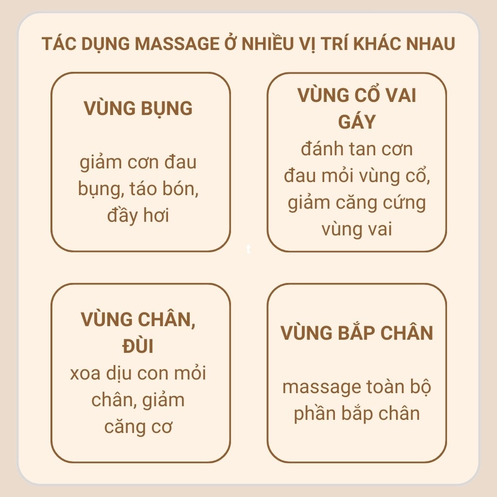 - Sản phẩm được sử dụng ở rất nhiều vị trí, vùng trên cơ thể như: bụng, lưng, vai, chân,... giúp hỗ trợ giảm đau mỏi, massage sâu kèm massage nhiệt mang lại cảm giác thoải mái, dễ chịu cho người dùng.