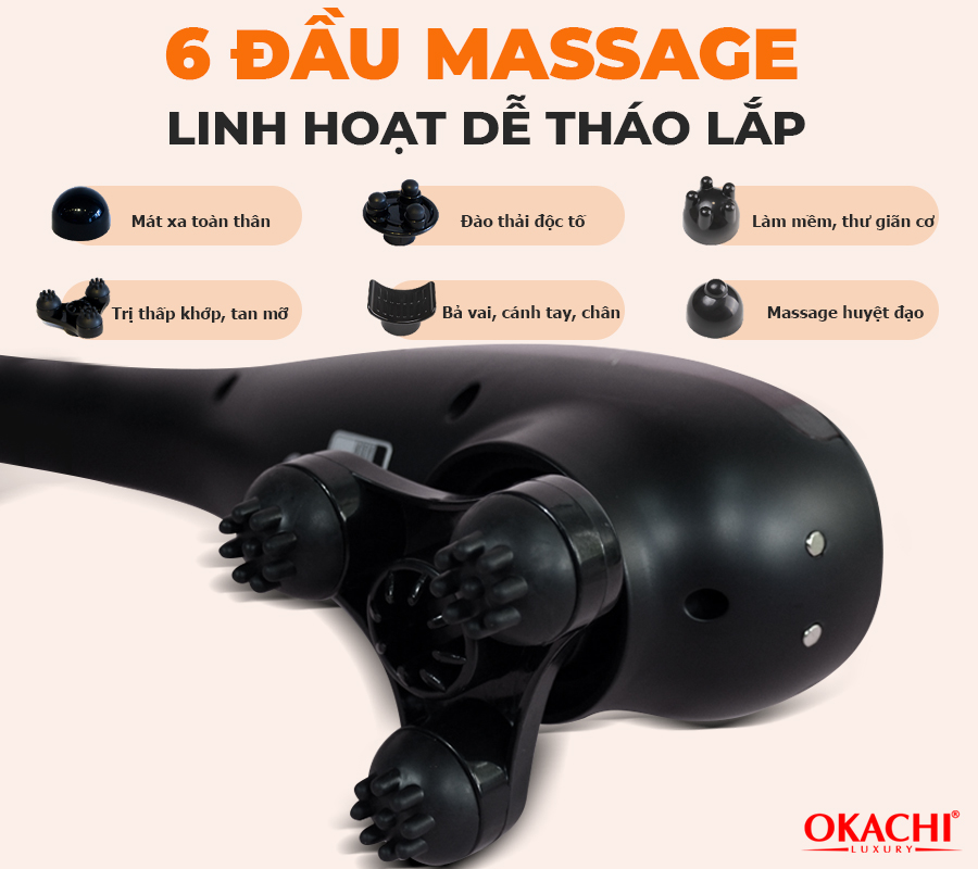 Máy massage cầm tay hồng ngoại OKACHI LUXURY JP-M610 (màu đen) có 6 đầu matxa, tương ứng cho từng nhóm cơ khác nhau. Mỗi đầu được thiết kế với kiểu dáng và công dụng riêng, mô phỏng kỹ thuật matxa của bàn tay chuyên viên. Chẳng hạn như xoa, đấm, vuốt, miết, ấn huyệt,…