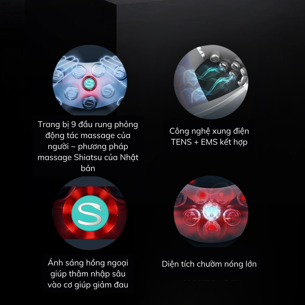 Điều chỉnh nhiệt độ thông minh với 4 cấp độ (35-65℃) 5 chế độ rung Làm ấm nhanh, nhiệt độ nóng ổn định tạo cảm giác massage thoải mái. Không ồn Dây đai đàn hồi