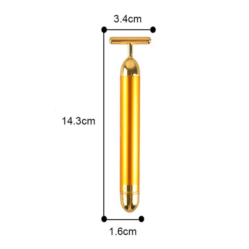 - Chống lão hóa, chống nhăn Thanh Lăn Massage Mặt Đầu 4 đầu Thông số kỹ thuật : Màu: Vàng - Kích thước 14.3 x 3.4 cm Sử dụng bằng pin AA, hợp kim cao cấp, sang trọng có hộp Bảo hành: 1 Tháng - Được chế tác bằng đồng mạ vàng Giúp chống lão hóa, chống nhăn, giảm bọng mắt, mặt vline đẹp Chức năng: