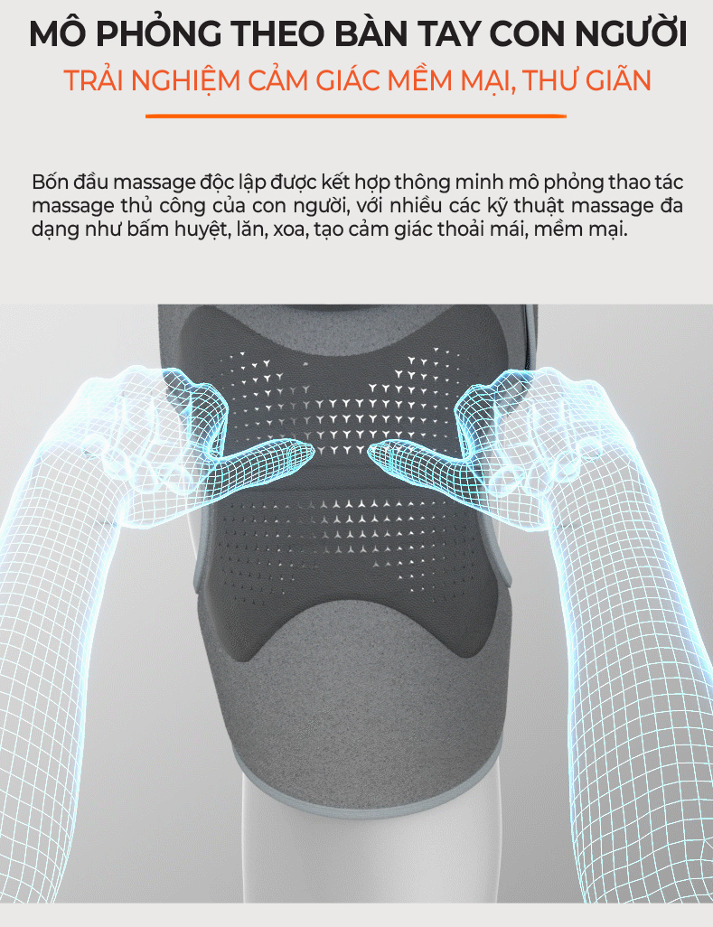• Massage toàn diện: Tích hợp động cơ massage rung vi mô tần số kép lên tới 7200 vòng/ phút tác động lên các điểm huyệt đạo giải tỏa áp lực lên các vùng khớp tạo cảm giác chân thực như được massage bởi tay của con người