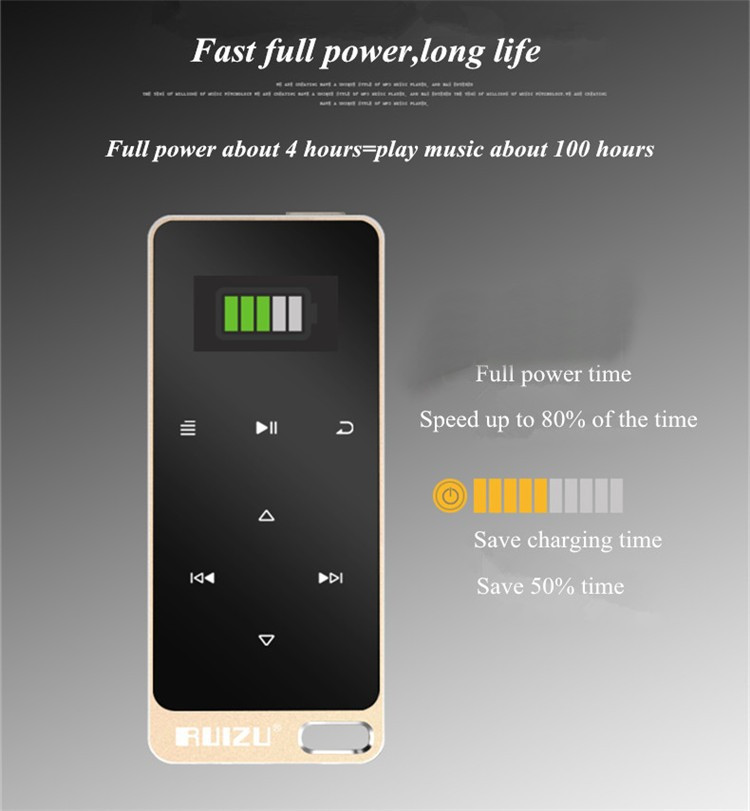 Ruizu X05 sử dụng pin Lithium cho thời lượng pin lên đến 100h, thời gian nghe nhạc liên tục trong 60h. Có thể mang đi bất kỳ đâu sử dụng trong thời gian dài như thê quả thật đây là thiết bị không thể thiếu đối với những ai yêu thích âm nhạc. Ngoài ra X05 còn có bộ nhớ trong lên đến 8gb cho người dùng lưu trữ những bản nhạc yêu thích được nhiều hơn (không hỗ trợ thẻ nhớ ngoài)