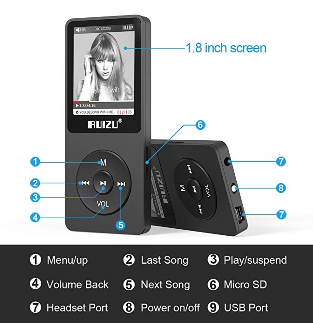 - Máy nghe nhạc RUIZU D19 thiết kế nhỏ gọn, kiểu dáng thể thao, màn hình màu TFT 2,4 inch cảm ứng mang lại hình ảnh sắc nét, kết nối bluetooth 5.0 ổn định trong phạm vi