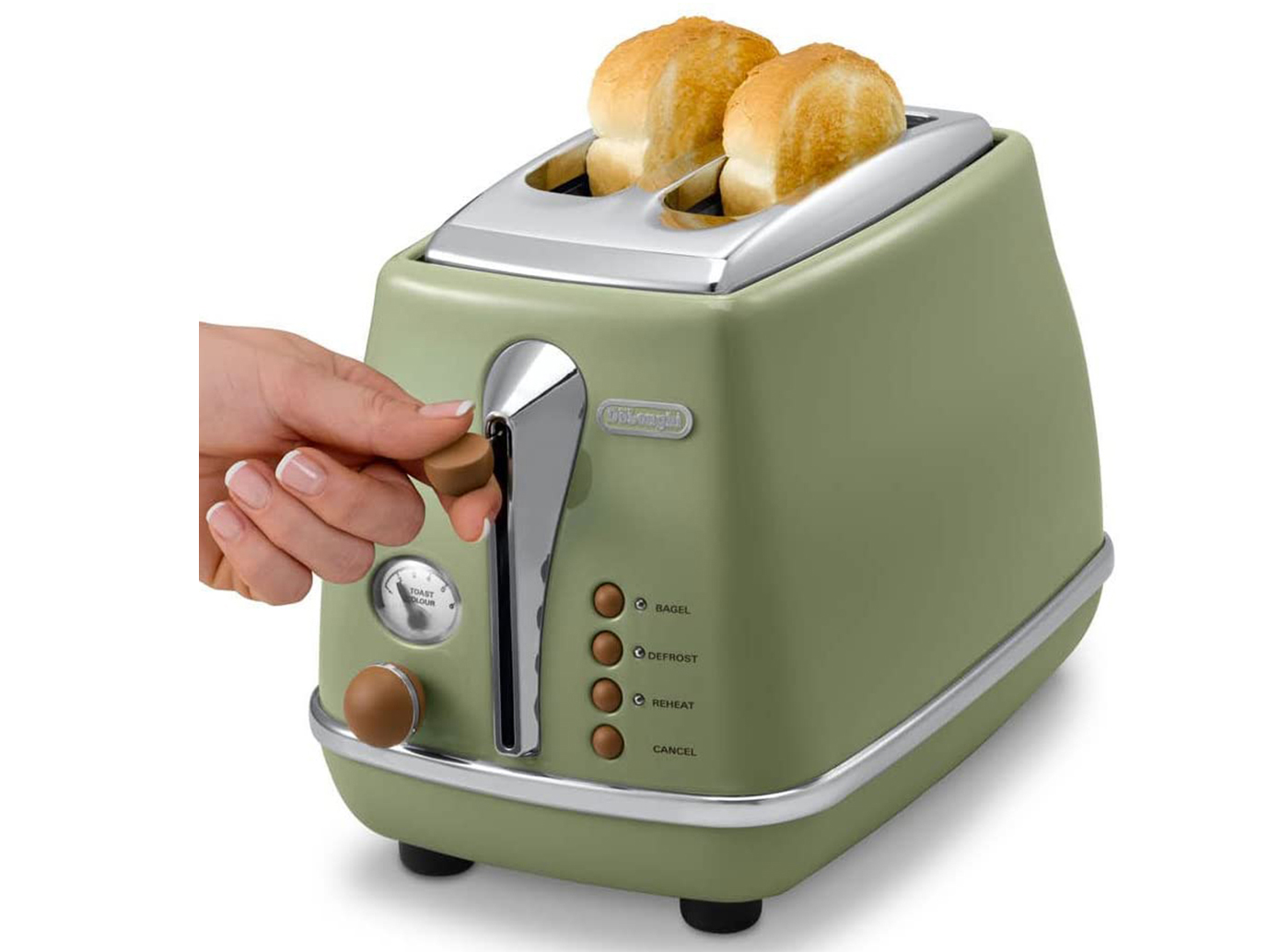 Mô Tả Sản Phẩm Máy nướng bánh mì Delonghi CTOV2103.GR thiết kế cổ điển với màu xanh rêu thu hút ánh nhìn, không chỉ nướng bánh mì mà còn rã đông, hâm nóng bánh, dễ